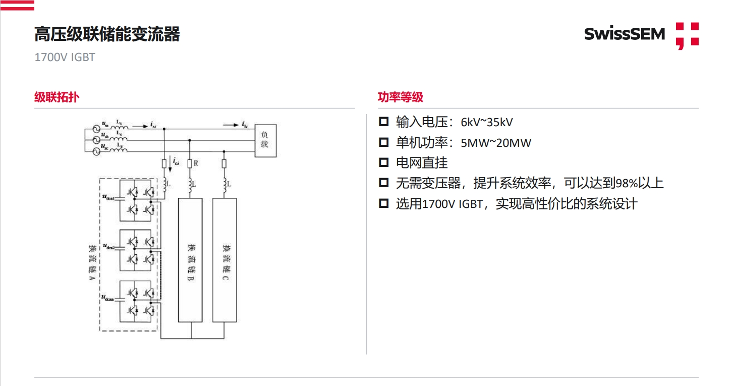 随后重点阐述了赛晶产品在储能变流器中解决方案。针对目前市场上的大功率组串变流器、集中式储能变流器和高压级联储能变流器,赛晶都有相应产品可供选用。同时,赛晶还针对市场的发展,会开发新型封装的功率模块,为客户提供更佳的选择。