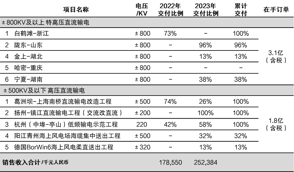 2023年,“金上-湖北”、“陇东-山东”、“宁夏-湖南”、“哈密-重庆”±800千伏特高压常规直流输电工程,以及阳江青州海上风电场海缆集中送出工程、德国BorWin6海上风电柔直送出工程、杭州低频输电示范工程等多个柔性直流输电工程等多个项目密集开工和交付,推动本集团2023年在常规和柔性直流输电的销售收入分别达到1.9亿元、0.6亿元,合计2.5亿元,较2022年大幅增长43%。