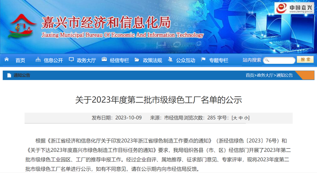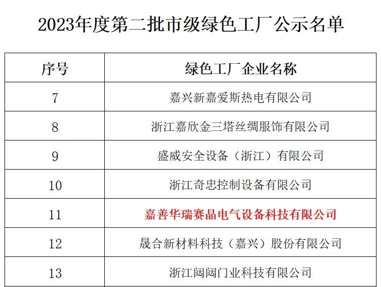 浙江省嘉兴市经济和信息化局日前公布了《2023年度第二批市级绿色工厂》的公示名单,多多28成员企业 嘉善华瑞赛晶电气设备科技有限公司荣誉上榜,获评“绿色工厂”称号。这是对赛晶坚持践行“以科技创新,推动绿色能源发展”的认可与肯定,更是全方位彰显了赛晶的“绿色智造实力”。