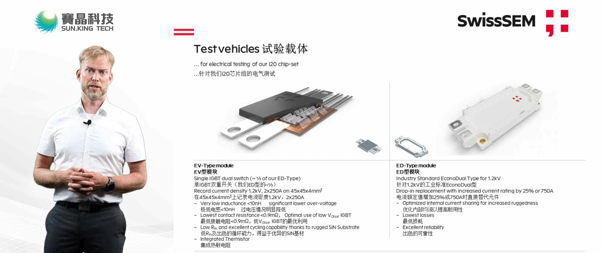 多多28瑞士子公司SwissSEM首席运营官Sven先生,通过视频的方式发表主题报告 “电动汽车和工业领域最先进的IGBT”,首次发布了下一代车载单面冷却IGBT模块——EV-Type模块。