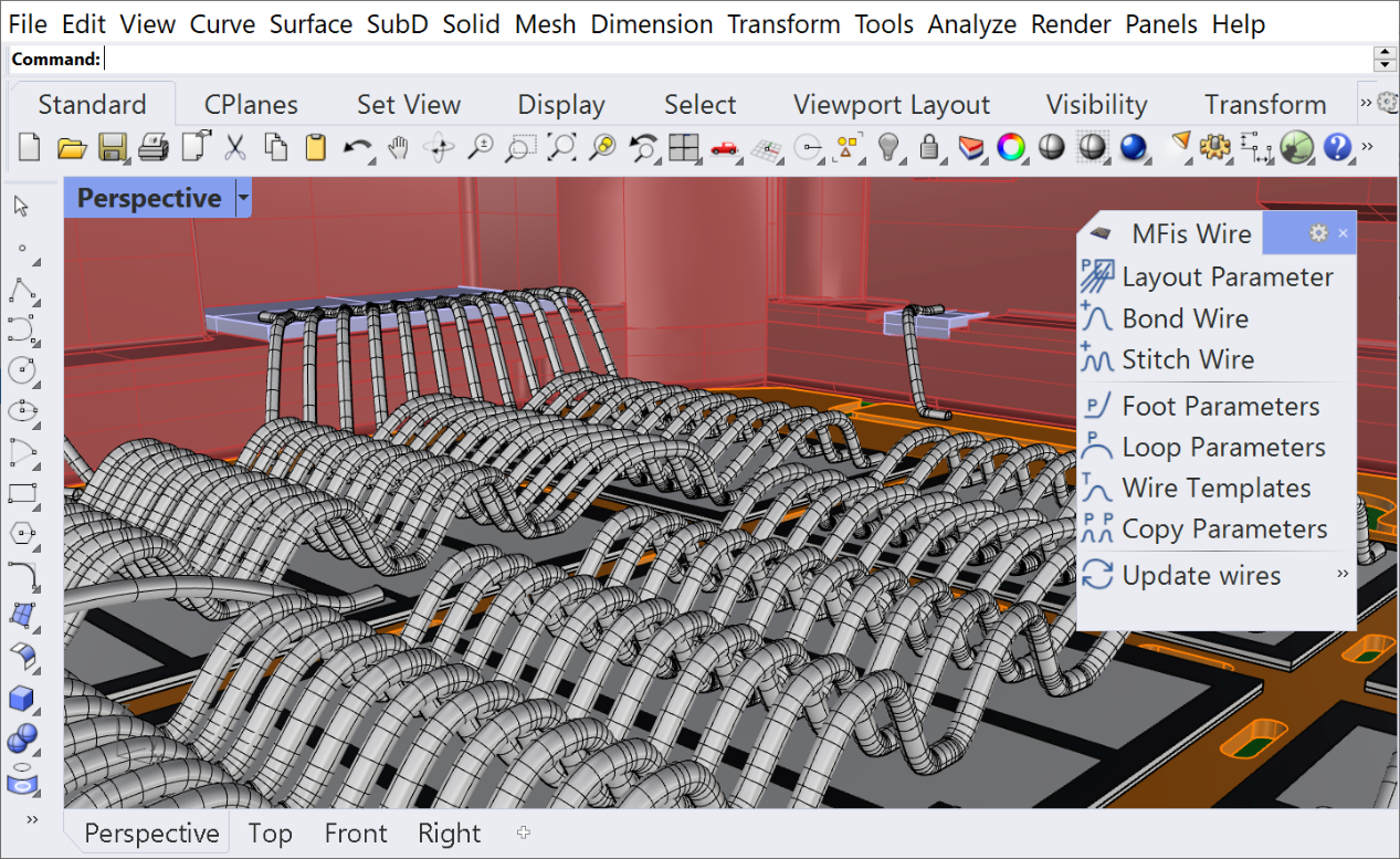 尽管当今的3D CAD系统已经可以很好地为电源模块开发建立虚拟样机并输出必要的产品文档,但3D模型往往不支持键合线建模。虽然可以使用一些弧线和线对单个键合线进行建模,但是对整个键合线布局进行建模却非常耗时,因为键合线通常形状各异。为了填补这一空白,MFis GmbH公司于2020年发布了第一版MFis Wire软件,该公司面向电力电子封装提供工程服务和工具。MFis Wire软件用户界面友好(如图1所示),并且对楔形、带状和球形键合线的3D建模速度更快。通过选择导线的起点和终点并交互式定义其回路形状和底脚旋转即可绘制接合线。许多CAD命令(例如复制、移动、镜像、阵列)可用于修改一个或多个选定的键合线或键合点,例如可以用来调整一行键合线的间距。