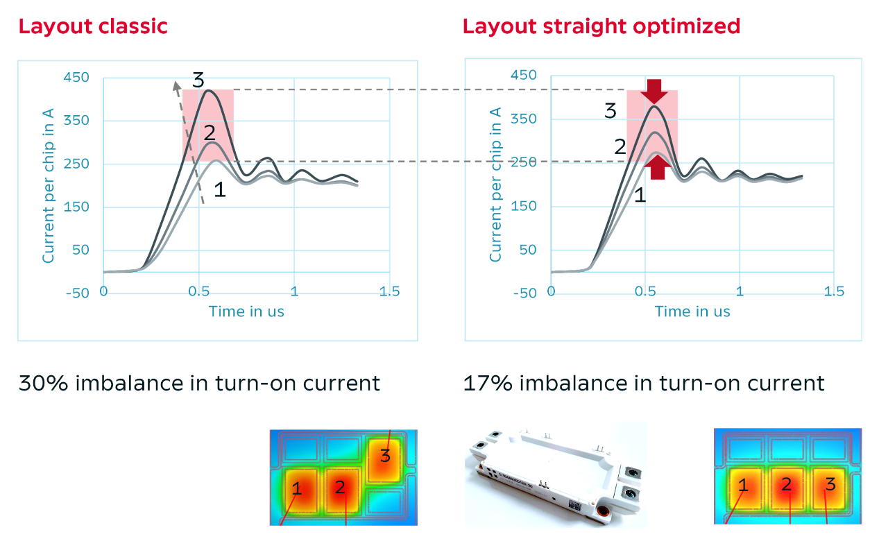 作为一家新兴公司,对于SwissSEM Technologies AG而言,在短时间内高质量地将其首款产品推向市场至关重要。为了实现出色的器件性能,电磁和热优化至关重要。行业标准的17毫米高、62 x 152毫米ED型IGBT模块,其冗长的设计对IGBT之间的内部电流均流提出了特殊的挑战。大多数经典布局或多或少都会面临芯片之间电流不平衡的问题,我们的目标是推出一种具有最佳电流一致性的模块,以充分发挥我们最新的IGBT i20这一代产品的优势。