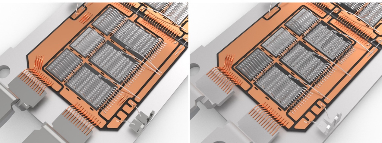 该软件可作为功能强大且价格合理的Rhino3D CAD平台的插件。创建键合线布局也仅仅需要CAD建模的基本技能。简短的介绍工作流程的培训视频可以指导用户在短时间内创建第一条导线布局。3D模型完成后,可以将其导出为许多行业标准的CAD格式,或转换为带有键合点坐标的2D工程图。借助Rhino3D强大的渲染功能,用户可以轻松地创建功率模块布局的逼真图像(如下图4所示)。