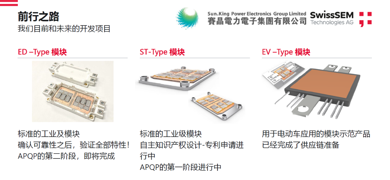 不仅由SwissSEM独家研发并已在申请专利的ST-Type模块,让大家眼前一亮。另一方面,针对电动汽车领域的第7代微沟槽技术i21芯片,使用新材料SiC的M2x芯片,以及具有独到技术的EV-Type模块,也让人感受到了SwissSEM对于电动汽车领域的高度重视和出色技术。