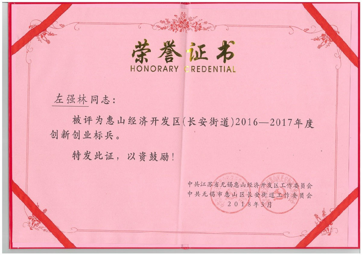 无锡赛晶电力电容器有限公司总经理左强林荣获惠山经济开发区(长安街道)“2016-2017年度创新创业标兵”荣誉称号,成为开发区创新创业的典范和榜样。这也是左强林总经理自2017年被评选为惠山区“先锋英才计划”管理先锋之后获得的又一项荣誉。