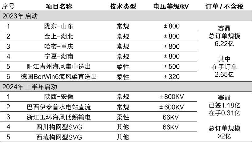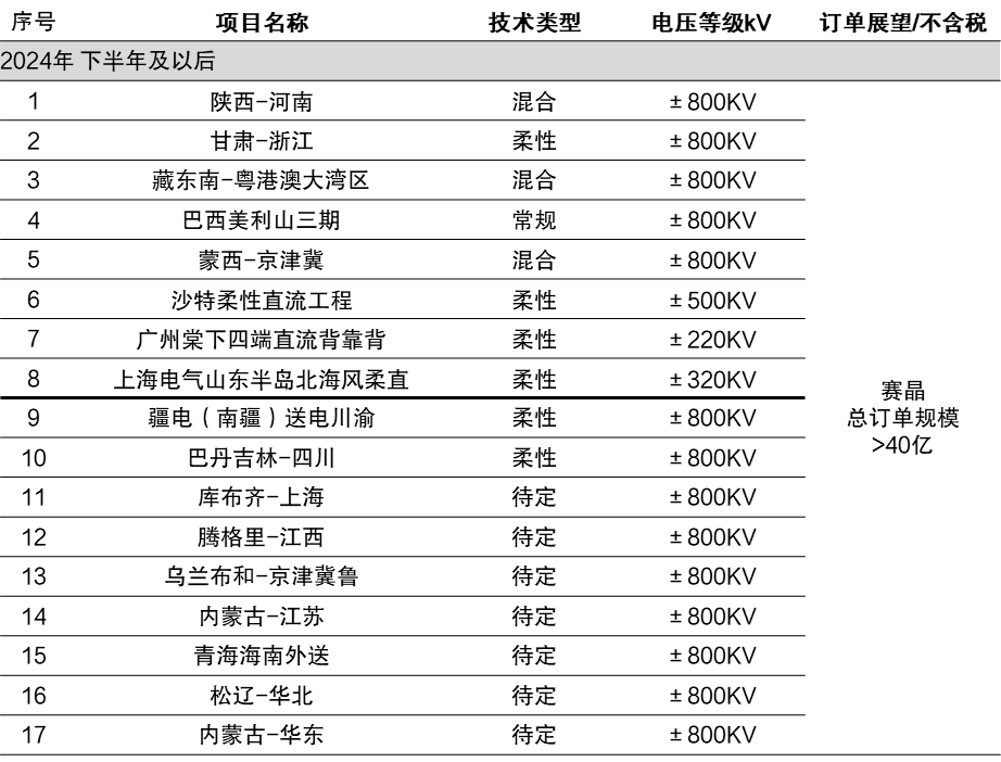 已公开的电网规划中17个项目,本集团潜在订单规模超40亿元。除了“陕北-安徽”、“甘肃-浙江”、“蒙西-京津冀”等国内直流输电工程,“沙特中南、中西”、“巴西美丽山三期”等中国企业中标的国外直流输电工程以外,近期国家电网公布了“疆电(南疆)送电川渝”、“巴丹吉林-四川”等“五交九直”特高压输电工程新规划。上述项目,以特高压输电为主,还包括海风直流送出、构网型低频输电等多种类型,总数高达17个,并有望为本集团带来总计超过40亿元的订单。