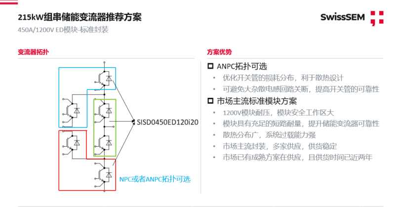 面对挑战,赛晶提出了系统性的解决方案。其核心在于采用新一代微沟槽栅芯片技术(如i23芯片组),该技术能显著降低导通和开关损耗,从源头减少发热。同时,配套的软恢复二极管技术能有效抑制关断电压尖峰,提升系统在大杂散电感环境下的可靠性。基于上述技术方向,赛晶推出了全面覆盖集中式与组串式储能应用的功率模块产品系列。针对集中式大功率变流器(1.725MW/2.5MW),推荐采用600A& 900A/1200V的ED模块,支持NPC/ANPC拓扑,具有短路耐量高、过载能力强等特点,且市场供货稳定;