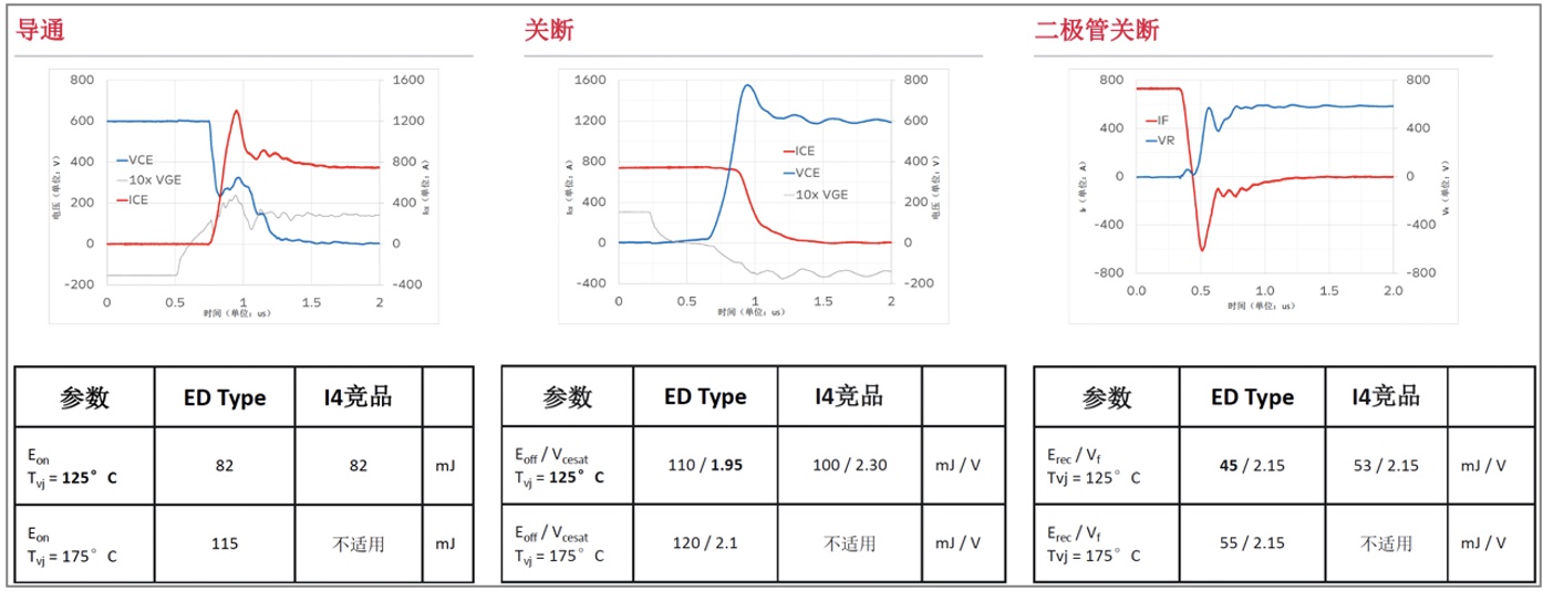 为了验证i20和d20芯片组开关特性优越性,多多28在已经量产的1200V 750A ED系列模块SISD0750ED120i20上与行业国际领军企业同款IGBT4的同平台模块进行了对比测试,需要说明的是IGBT4模块目前最高结温只有150℃。通过对比发现两个模块开通损耗基本相当,关断损耗采用i20芯片组的ED模块略高,但饱和导通压降的ED模块更低。基于d20芯片组ED模块二极管与IGBT4具有相同的正向压降,且能够保持更低的反向恢复损耗,从测试来看采用i20和d20芯片组模块要优于国际领军企业的同类第4代IGBT模块。