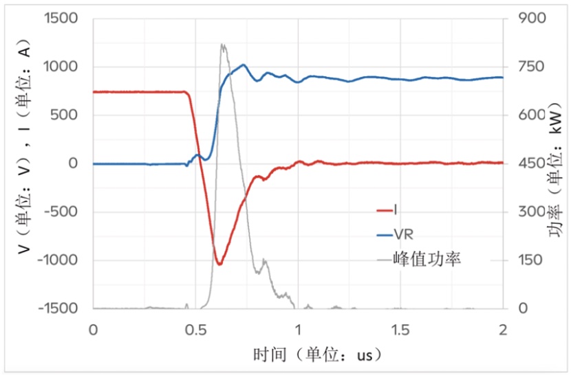 二极管的安全工作区主要取决于二极管的开关特性。为了评估二极管的稳健性,通过将外部栅极电阻Rgon减小到最小值,然后增加栅极电压Vge,从而提高二极管的换向速度。对于选定的极端情况:750A的电流和900V的反向电压,IGBT开通电压21V,进行双脉冲测试。实验发现:在175°C的外壳温度下,二级管的峰值功率超过800kW,di/dt超过10kA/us,器件依然可以稳定。选定的测试条件远远超出了任何数据表建议,进一步体现了多多28d20芯片组的高可靠性。