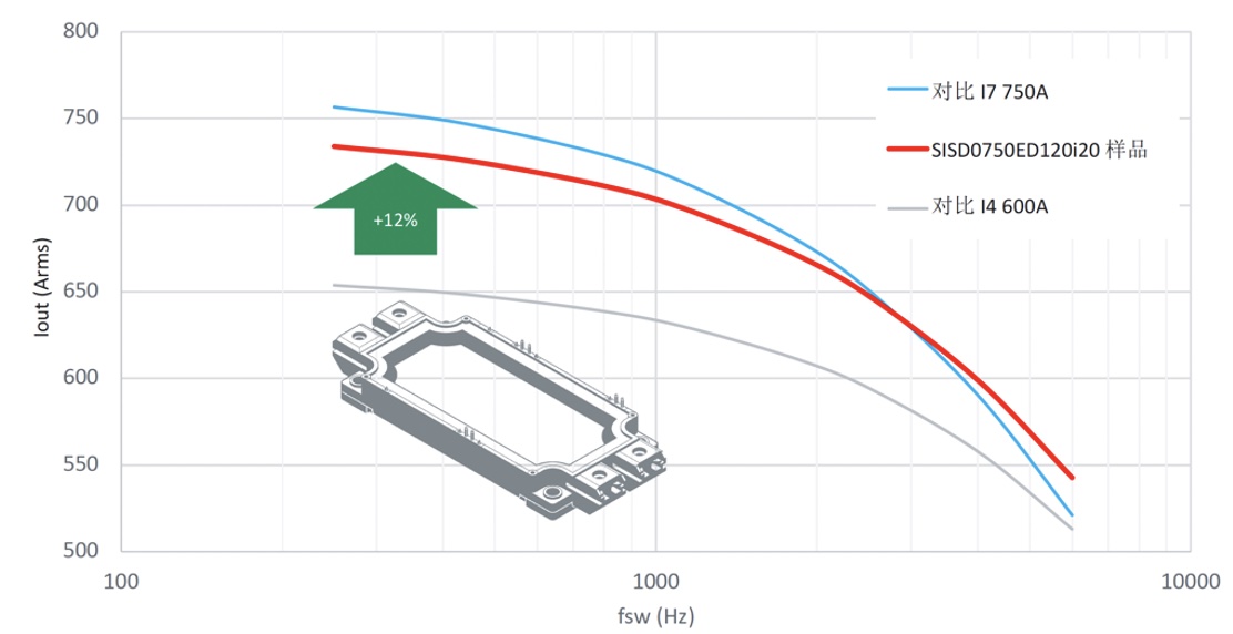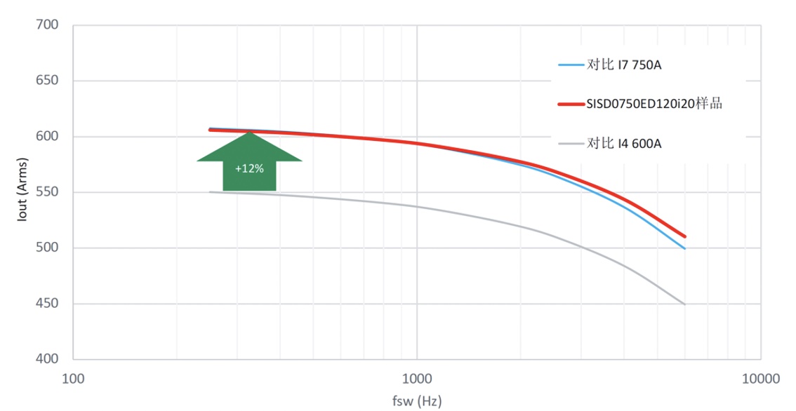 为了在系统应用层面验证i20和d20芯片组的性能,将基于i20芯片组的ED型750A半桥模块与竞争对手i4-600A和i7-750A两款模块分别在整流模式和逆变模式进行了对比仿真。性能曲线图反映了逆变器输出功率(或电流)与开关频率的关系,仿真热阻值取自数据表,而器件的静态和动态损耗取自测量值。逆变工况下,ED-750A额定模块在最坏的情况下比最先进的i7 740A模块功耗低3%,当开关频率直到3kHz时达到平衡。而与目前应用居多的i4-600A模块相比,ED型模块能够提升超过10%的性能。在整流器模式下,多多28ED模块的性能与最新的i7-750A模块基本一致,相比i4-600A模块相比,性能同样可以提高10%以上。